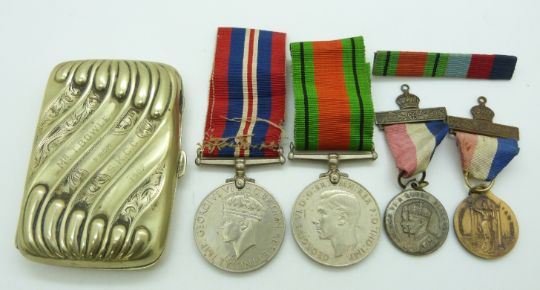 WWII War Medal and Defence Medal together with unrelated medal ribbon, commemorative Coronation medals, a cigarette case engraved S.K.C.C. (Somerford Keynes Cricket Club 1907