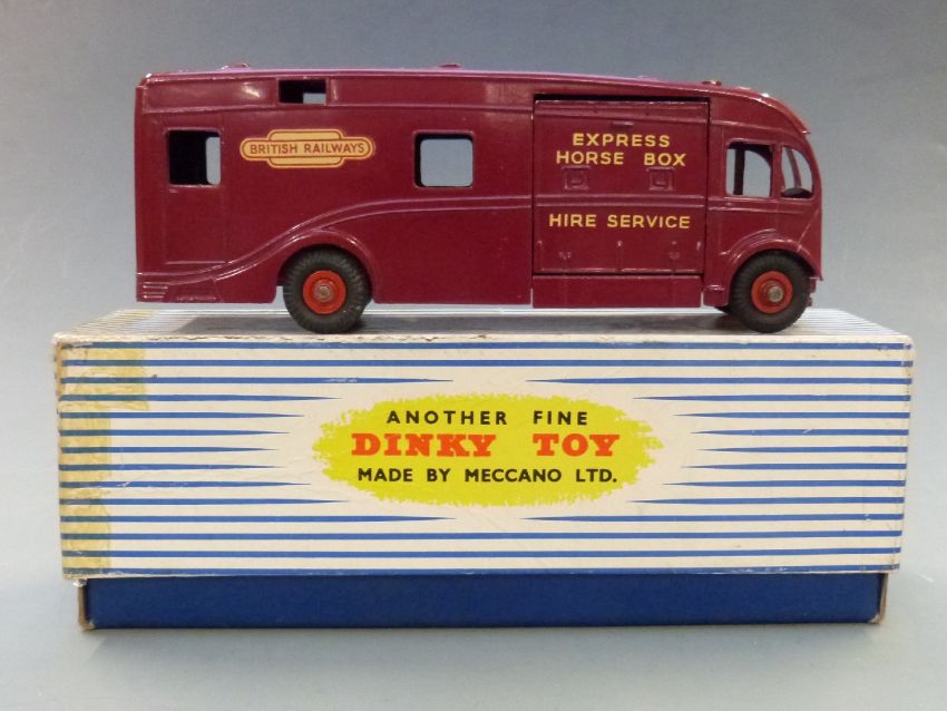 Dinky Toys diecast model Horse Box with maroon body, red hubs and 'British Railways Express Horse Box Hire Service' decals, 981, in original box.