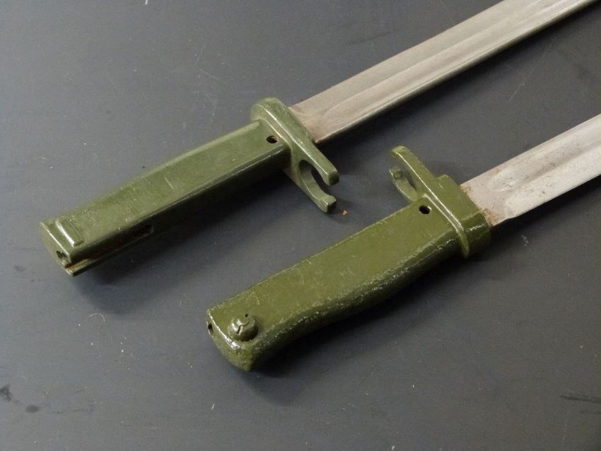 Two German 88/98 pattern Ersatz all steel bayonets, one with acceptance stamp, both with 31cm fullered blades and scabbards