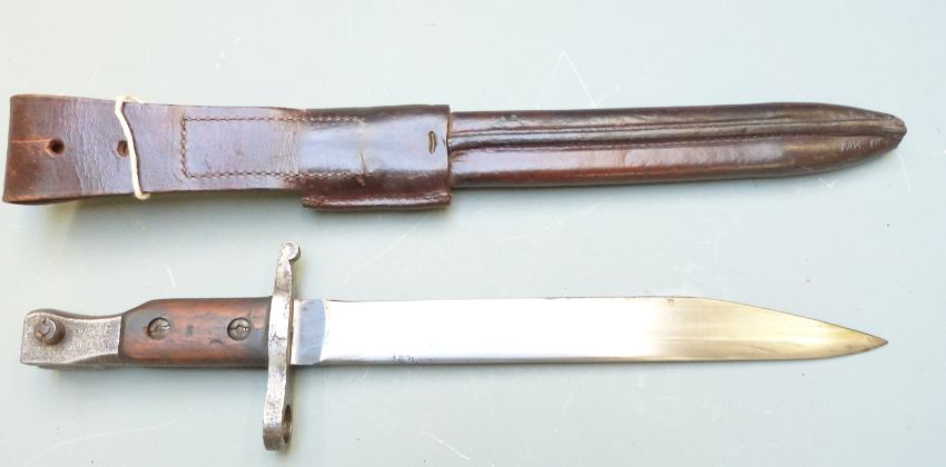 Canadian M1910 pattern knife bayonet for the Ross rifle with some clear stamps to pommel, 25cm unfullered hatched pointed/sharpened blade and scabbard with integral frog
