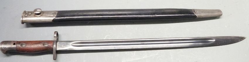 British 1917 pattern sword bayonet, some clear stamps to ricasso and pommel, 43cm fullered blade, with scabbard