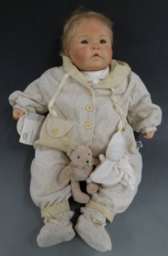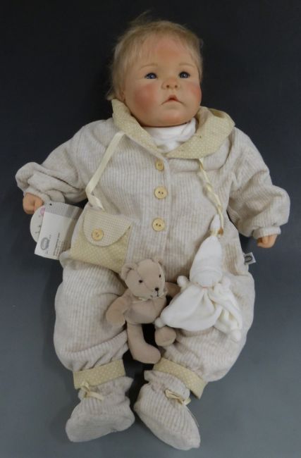 Didy Jaobsen for Gotz doll with closed mouth, blue eyes, blonde hair and soft body, in corduroy all in one, with original label, 60cm tall.