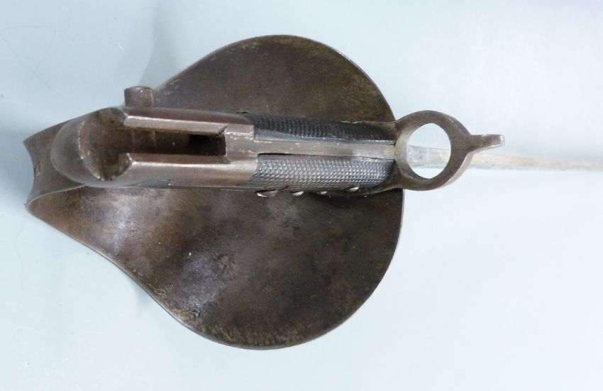 Royal Navy 1859 second pattern cutlass bayonet with chequered grip, bowl guard, 68cm blade and leather scabbard
