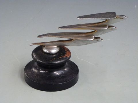 Art Deco Desmo vintage car mascot formed as three stylised birds flying in formation, on ebonised base, overall height 11cm