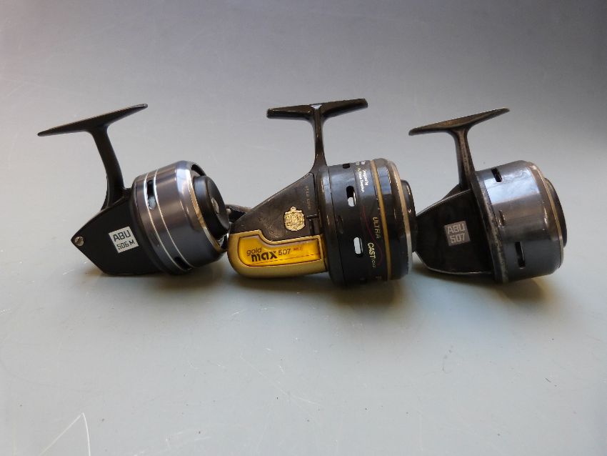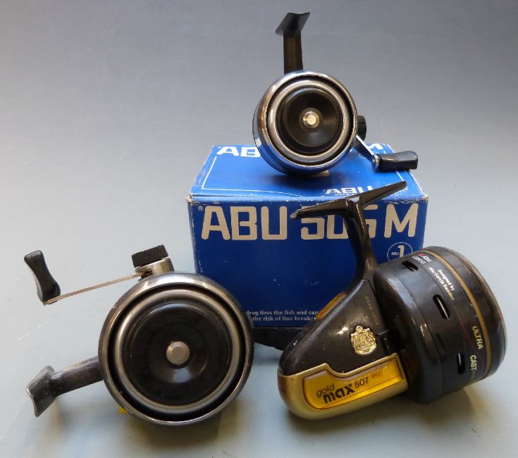 Three Abu closed face fishing reels including Abu 506M in box, possibly unused, Abu 507 and a 507 Max Gold Mk2
