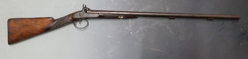 Westley Richards 14 bore side by side percussion hammer action gun with named and engraved locks, engraved dolphin hammers, pineapple finialled trigger guard and top plate, chequered grip and forend, vacant wrist cartouche and 29.5 inch platinum inlaid barrels, overall length 116cm.