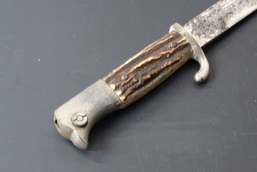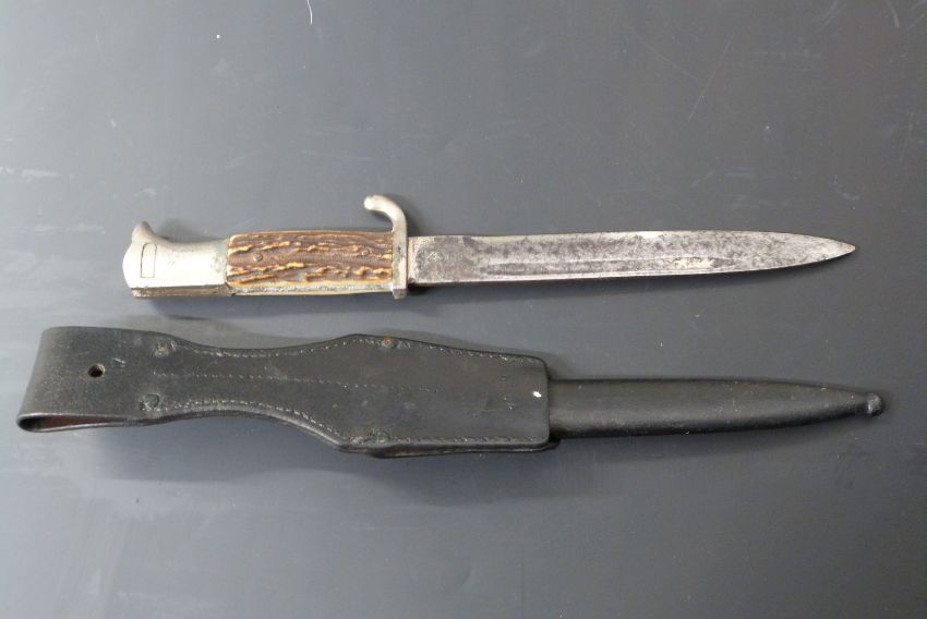 German KS98 pattern bayonet with Puma maker's mark to ricasso, 19cm fullered blade, staghorn grips, scabbard and frog