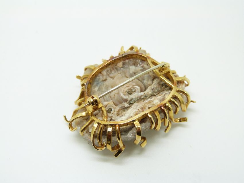 An 18ct gold brooch set with a rough crystal, 4.5 x 3.7cm, in Garrard box