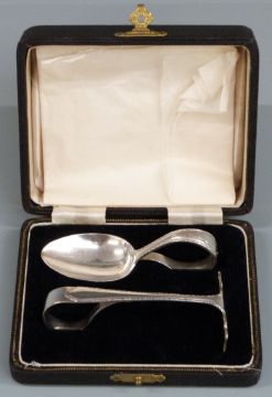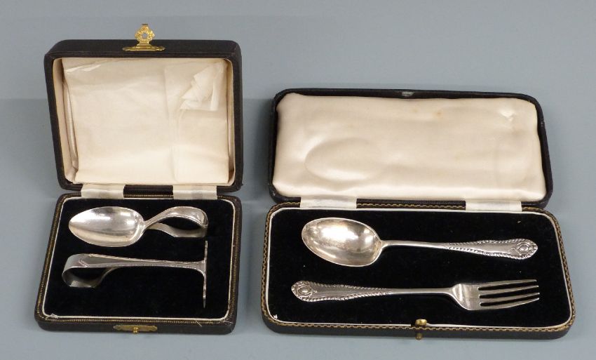 Cased hallmarked silver fork and spoon set together with a cased hallmarked silver baby's spoon and  pusher, weight of all items 91g