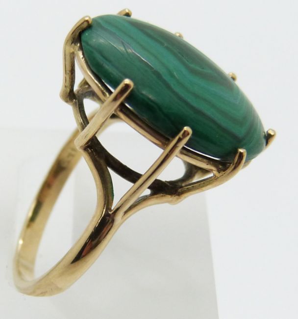 A 9ct gold ring set with a malachite cabochon, 4.5g, size K/L