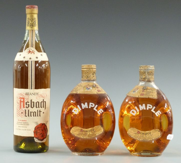 Two bottles of Haig Dimple 70 proof Scotch Whisky and Asbach Uralt brandy, ex-NAAFI