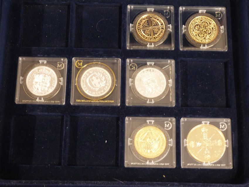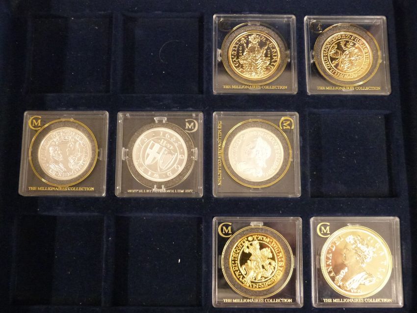 Eight Millionaires Collection coins in wooden collector's case and fifteen Westminster Coins pictorial crowns with certificates, in case