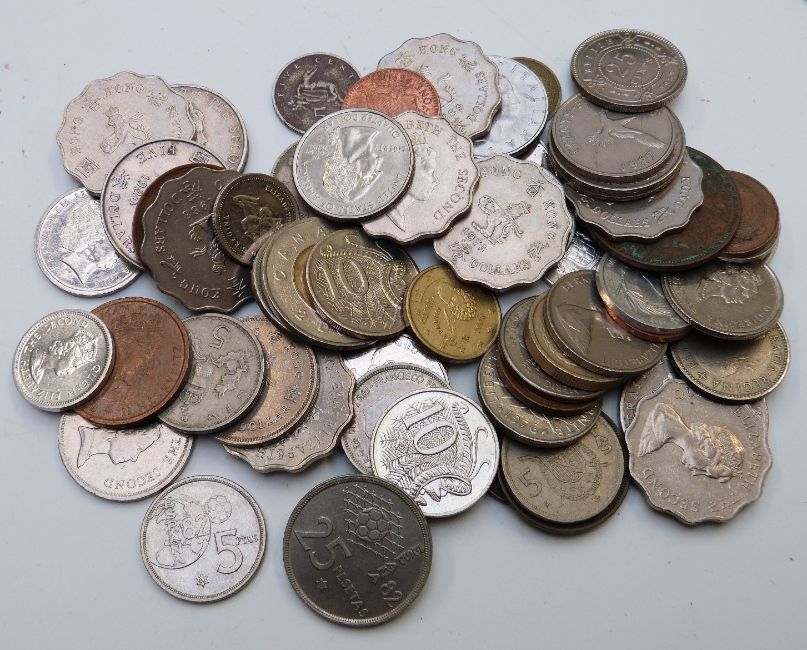 A collection of English farthings including William V, Charles II, Victorian etc together with further English coins, some in a frame and some world coinage