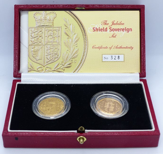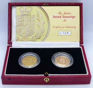 Jubilee sovereign pair set comprising 1862 young head Victoria gold full sovereign and a 2002 Elizabeth II gold full sovereign, both with shield backs, cased with certificate no 328