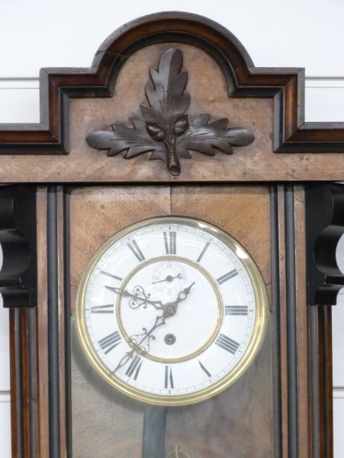 19thC mahogany cased Vienna regulator wall clock with the single train movement, enamelled Roman dial, gilt bezel decoration and secondary seconds dial, the arch top set with carved oak leaves, height approximately 116cm