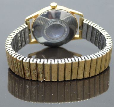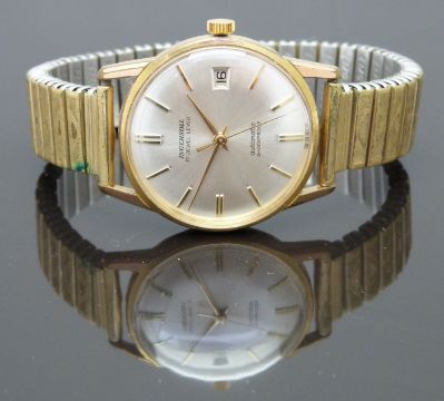 Ingersoll gentleman's automatic wristwatch with date aperture, gold hands and markers, silver dial, gold plated case and 17 jewel lever movement, on expanding bracelet, case diameter 34mm.