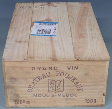 Case of twelve bottles of Chateau Poujeux Moulis Medoc 1988 red wine, 750ml, 12.5% vol, sealed in original wooden case.