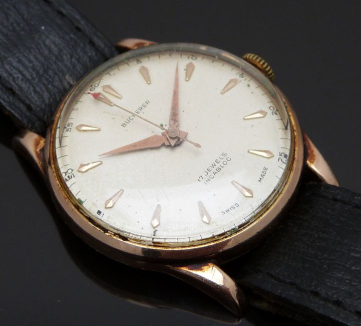 Bucherer gentleman’s wristwatch  with gold hands and hour markers, silver dial, gold plated case and Tevo Watch Co 17 jewel movement, case diameter 33mm.