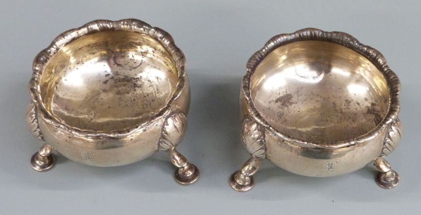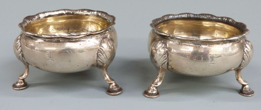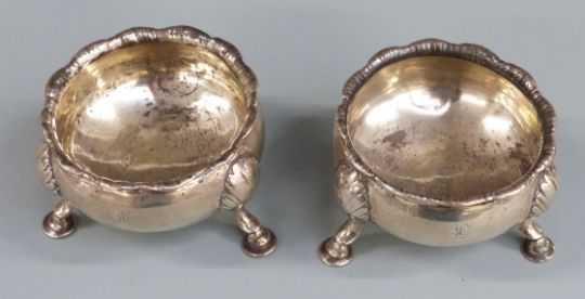 Pair of Victorian hallmarked silver open salts, with shaped rims and raised on pad feet, London 1870 maker Henry William Curry, width 8cm, weight 156g