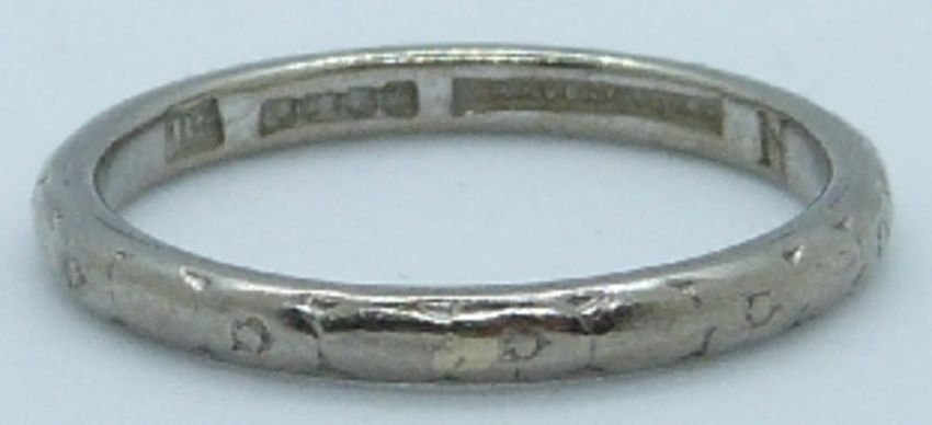 An 18ct white gold ring/ wedding band stamped Bravingtons, 3.1g, size M/N