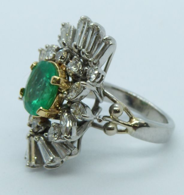 A platinum ring set with an oval cut natural Colombian emerald of approximately 3ct surrounded by marquise, baguette and round cut diamonds, with GIA certificate, 13.5g, size M
