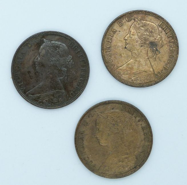 Victoria 1860 halfpenny, toothed borders, together with a beaded bordered example and a further 1873 halfpenny, all IVEF