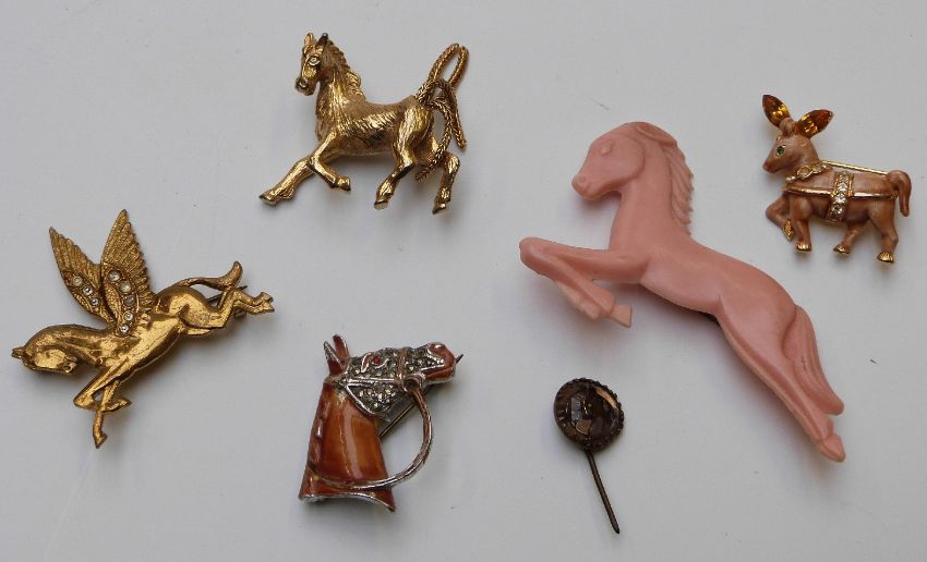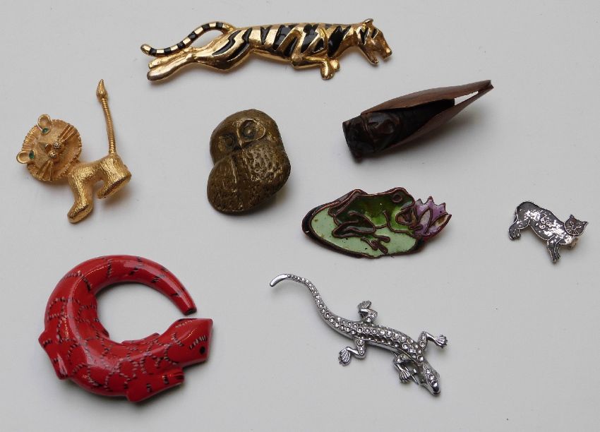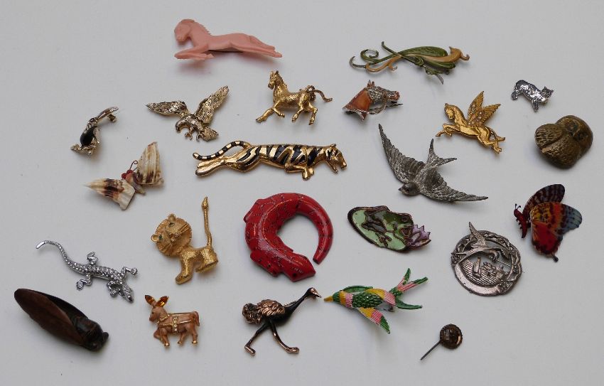 A collection of brooches including enamel and marcasite horse, lizard, enamel frog, Sphinx horse, lion, birds etc