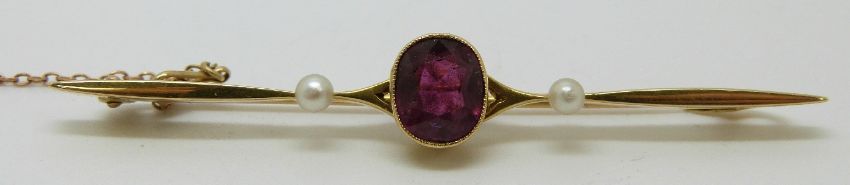 A 15ct gold brooch set with a garnet and pearls (4g), in original box