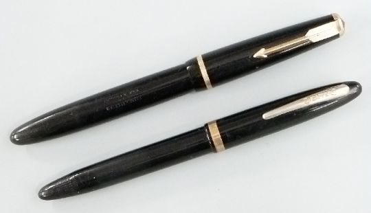 Parker Duofold fountain pen with black plastic body and 14ct gold nib numbered 35 together with a similar Sheaffer fountain pen with 14ct gold nib numbered 23