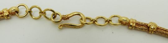 Indian yellow metal fringe necklace of stylised floral and foilate design links below ball finials, on rope style looped chain, 51g