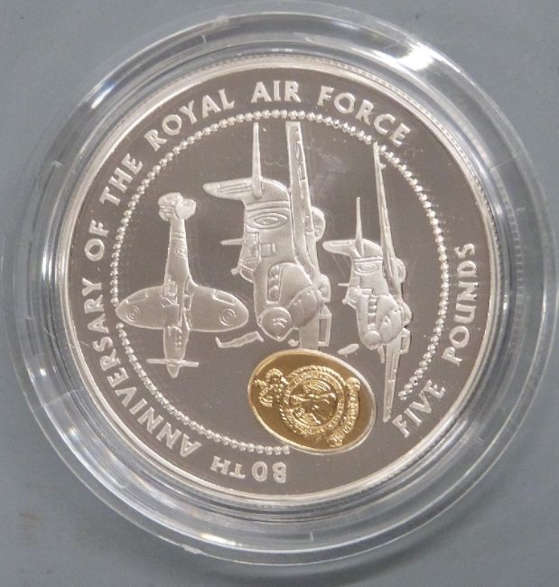 Royal Mint silver proof WWII £2 coin, cased with certificate, 80th Anniversary of the RAF £5 crown, George V 1935 rocking horse crown and a 1956 half crown, all cased and a replica Edward enthroned silver 'hammered' coin, 3.1g