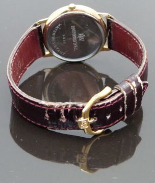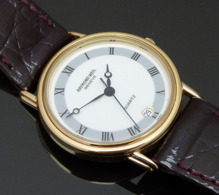 Raymond Weil gentleman's wristwatch with date aperture, blued Breguet hands, grey chapter ring, white dial, gold plated case and quartz movement, on brown leather strap, case diameter 31mm, serial number 5532.