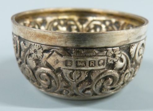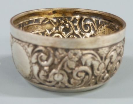Cased set of four Victorian hallmarked silver salts with embossed decoration, Sheffield 1884, maker Martin, Hall & Co, diameter 48mm, weight 97g