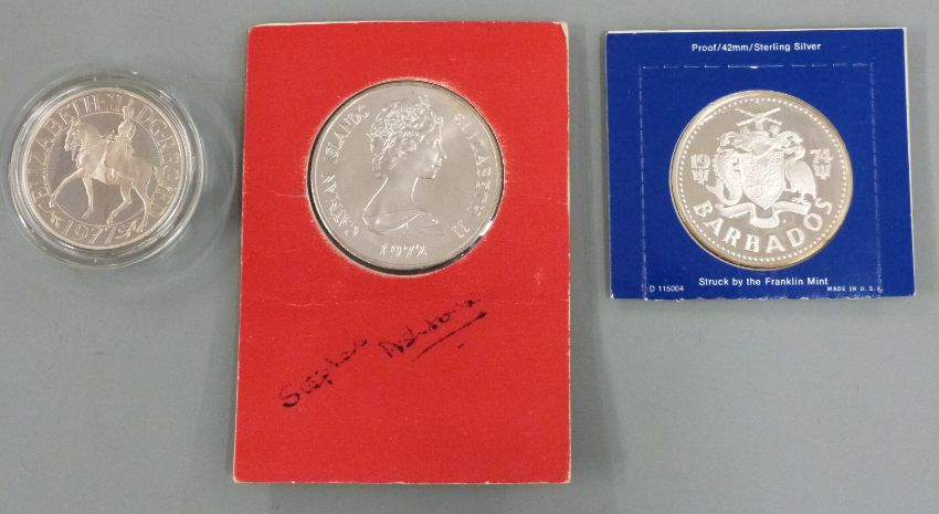 Four silver commemorative type coins to include Barbados 10 dollar, Bahamas 10 dollar, Cayman Islands 25 dollar and a 1977 UK Jubilee crown, three cased, one with presentation pack, most with certificates