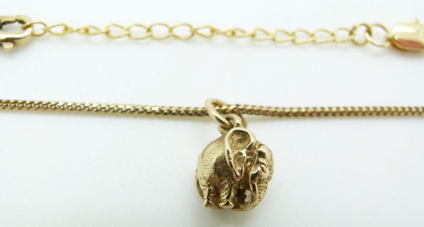 A 9ct gold elephant pendant and 9ct gold necklace, 9.4g