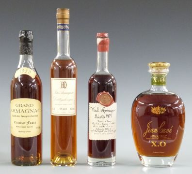 Four bottles of Armagnac comprising Christian Faure Grand Armagnac 1953, 700ml, 40%, Jean Cavé XO Armagnac, in original wooden case, Dartigalongue Bas Armagnac, 500ml, 40% vol, in original wooden case and Recolte 1971 Vieil Armagnac, 500ml, 40% vol, in original wooden case.