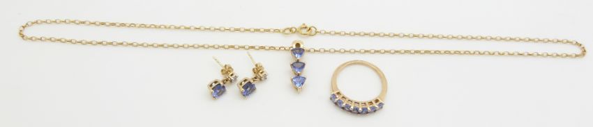 A suite of 9ct gold jewellery set with tanzanite, comprising earrings, pendant and ring