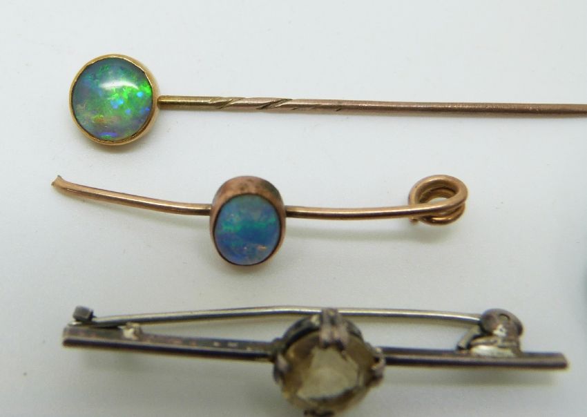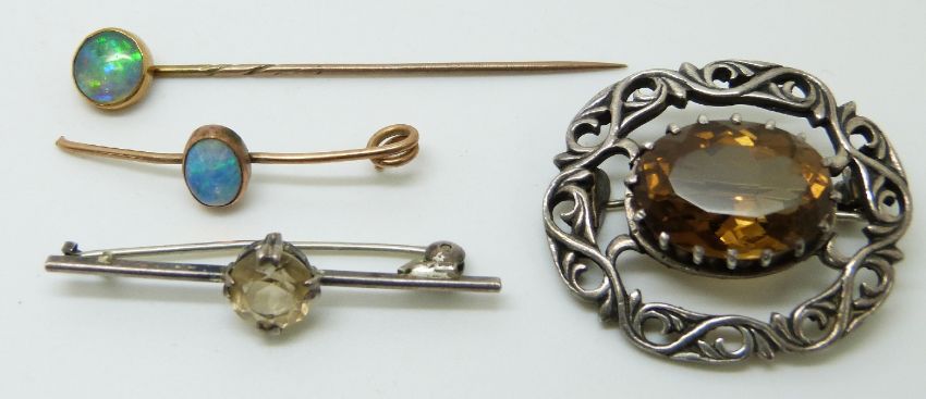 Scottish silver brooch, Edwardian opal stick pin and similar brooch, and a silver brooch