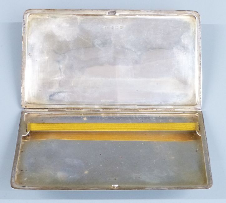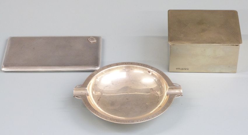 Elkington George V hallmarked silver ashtray, Birmingham 1934, width 15cm, hallmarked silver cigarette case with slide opening and applied coronet to front, length 15cm, weight of both 370g all in and a plated cigarette box