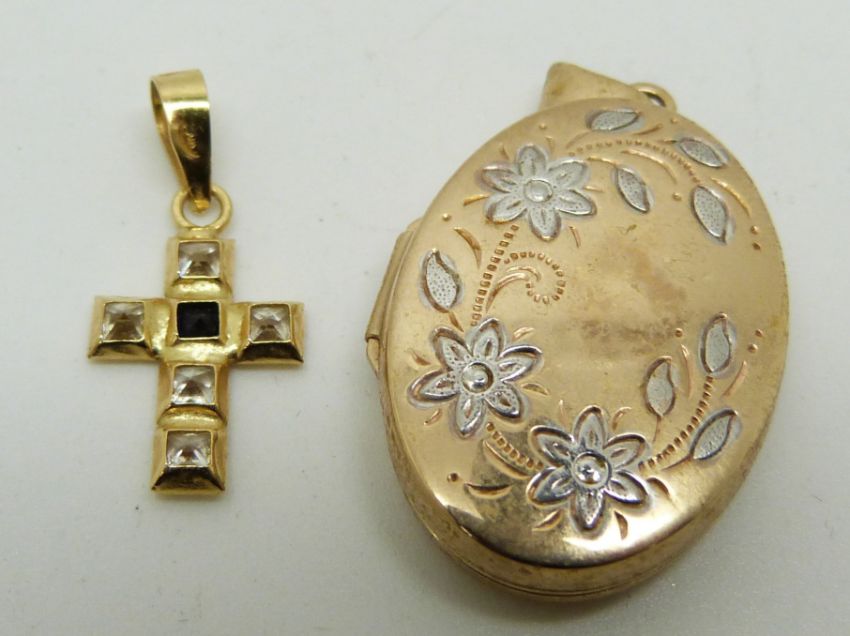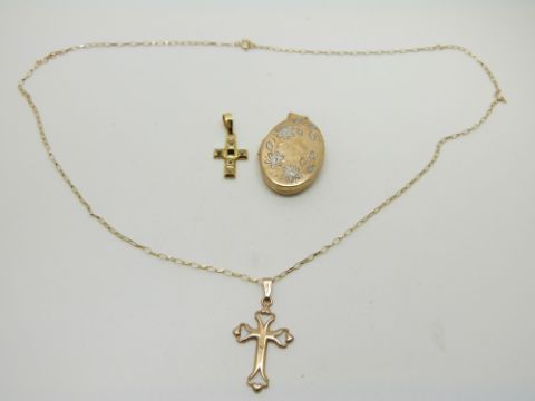 A 9ct gold chain/ necklace, 9ct gold locket and a 9ct gold cross, 4.8g