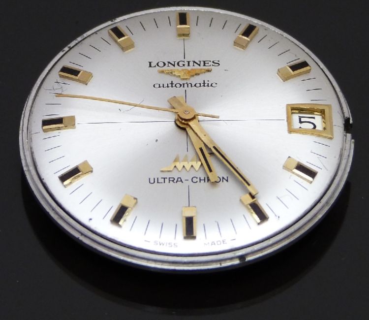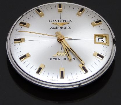Longines Ultra-Chron gentleman's 17 jewel calibre 431 automatic wristwatch movement with date aperture, gold hands and markers and silver dial, 30mm in diameter.