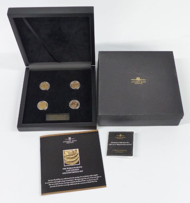 The London Mint Office 'Centenary of the Great War' four sovereign set comprising 1914, 1915, 1916 and 2014 gold full sovereigns, in fitted case with certificate