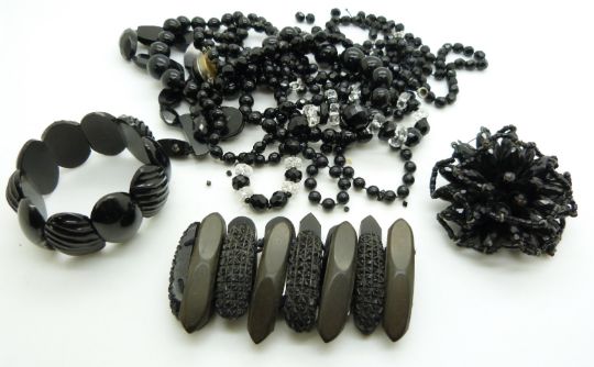 A collection of jet jewellery including Victorian bracelets, Art Deco French jet and crystal, West German brooch etc