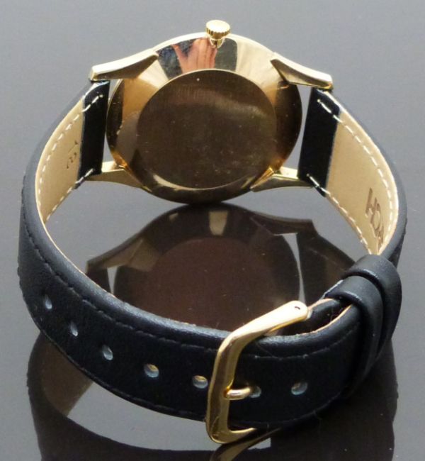 Marvin 9ct gold gentleman's wristwatch with gold hands and Arabic numerals, silver dial and signed 17 jewel caibre 621 movement, on black leather strap, case diameter 34mm, serial number 01939.
