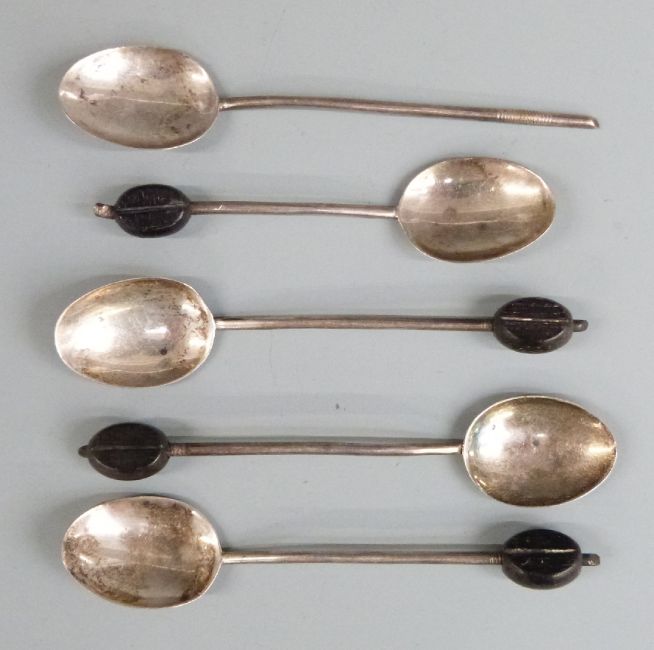 Set of six continental silver gilt coffee or teaspoons marked 800 together with five hallmarked silver coffee bean spoons, weight 89g
