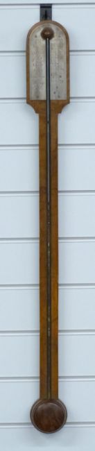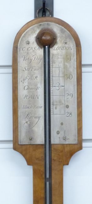 Georgian C Casa of London stick barometer with silvered prediction dial, the walnut case with turned cistern cover, approximate height 82cm
