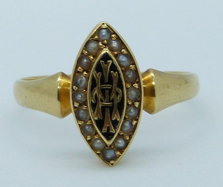 Victorian 18ct gold ring in a marquise shape set with enamel surrounded by seed pearls, 3.3g, size S