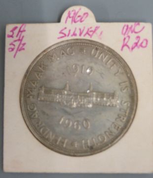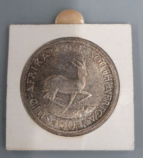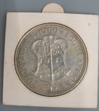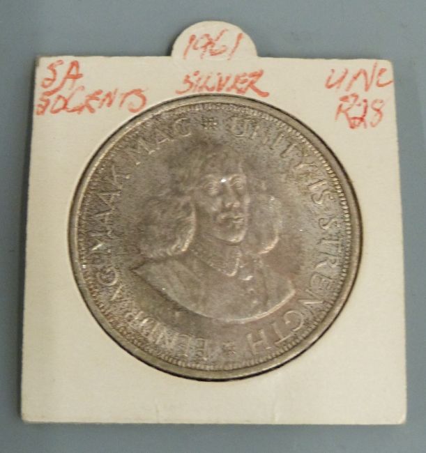 Four various uncirculated South African crown sized silver coins to include 1953 Rhodes Centenary, 1952 and 1960 five shillings and 1961 50 cents and a cased 1994 UK silver proof £1 coin