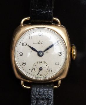 Avia 9ct gold ladies wristwatch with inset subsidiary seconds dial, blued hands, black Arabic numerals, silver dial and cushion shaped case, on black leather strap, case diameter 21mm.