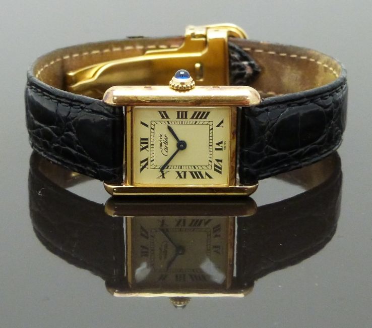 Must de Cartier Tank Vermeil silver gilt ladies wristwatch ref. 1613 with blued hands, black Arabic numerals, cream dial, sapphire set crown and quartz movement, on black leather strap, case diameter 20mm, serial number CC417948.